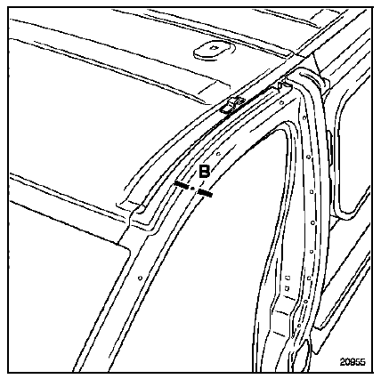Le remplacement de cette pièce ne peut être effectué qu'après dépose du panneau latéral arrière partie avant et du renfort de côté d'auvent.
