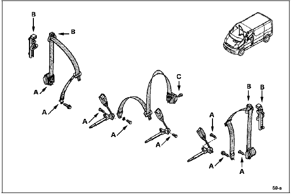 Important : avant la dépose d'un prétensionneur d'un airbag ou d'une ceinture équipée de prétensionneur, verrouiller le boîtier électronique à l'aide d'un outil de diagnostic voir chapitre 88 "airbag et prétensionneurs".