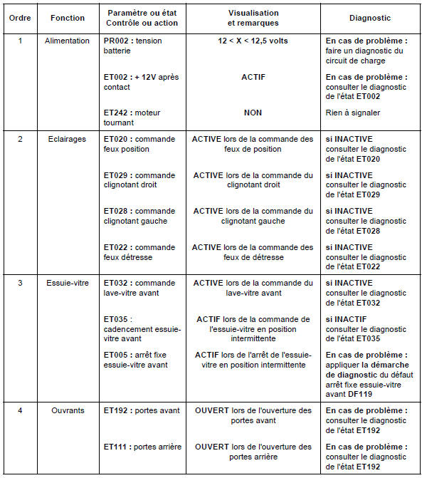 N'effectuer ce contrôle de conformité qu'après un contrôle complet avec l'outil de diagnostic. Les valeurs indiquées dans ce contrôle de conformité ne sont données qu'à titre indicatif. Condition d'exécution : moteur arrêté sous contact.