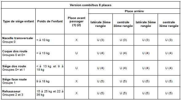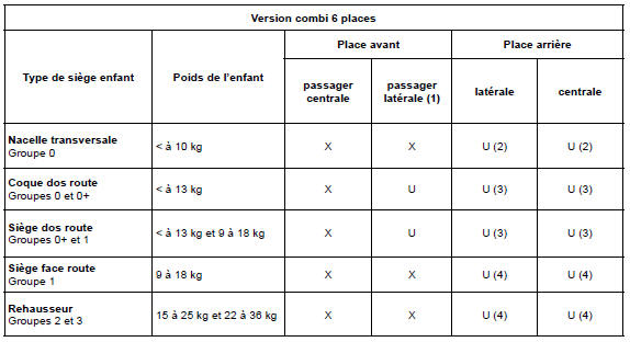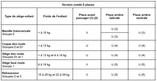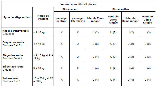 X = place non autorisée à l'installation d'un siège enfant de ce type.