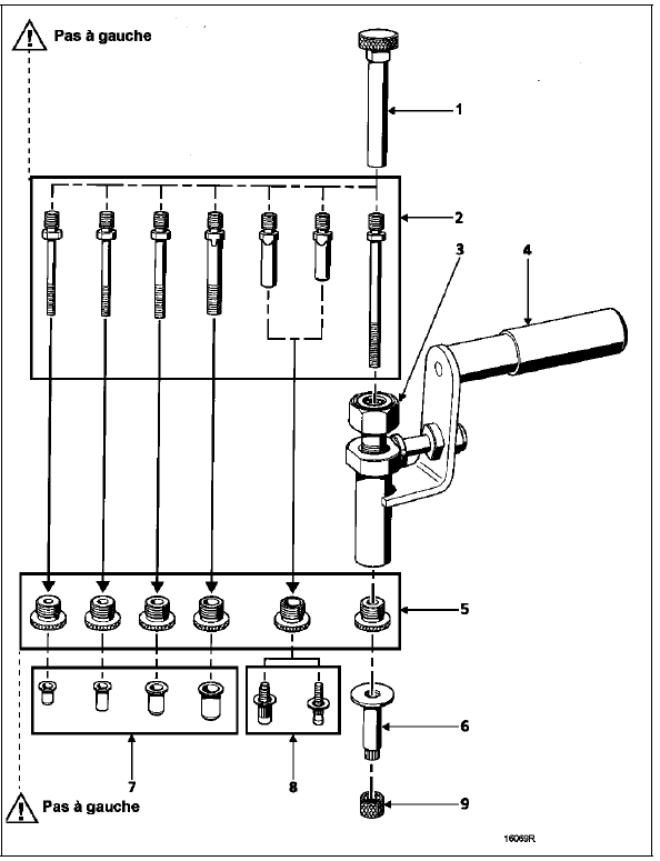 Pour la pose de l'écrou spécial (6), le tirant passe à travers l'écrou à sertir et se visse sur l'écrou de poussée (9).