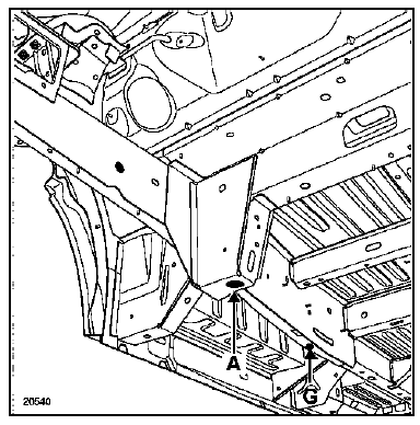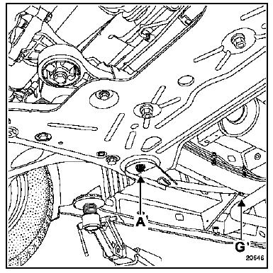 En cas de remplacement du support arrière de berceau, cette référence est remplacée provisoirement par le point (g), situé sur la par tie arrière de longeron avant, le point (a) servant alors à positionner l'élément remplacé.