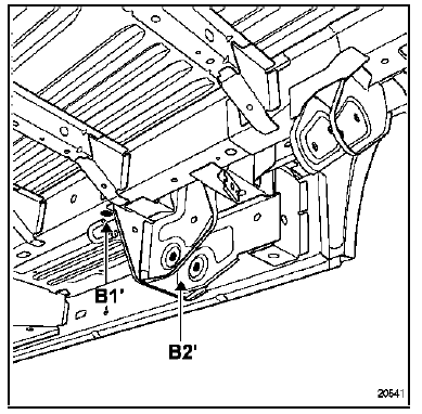 En cas de remplacement du longeron arrière complet, cette référence est remplacée par le point (g), situé sur la partie arrière de longeron avant, les points (b) servant alors à positionner la pièce remplacée.