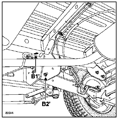 Le calibre est broché dans la chape de fixation du tirant de train arrière (b2') ou centré dans le trou pilote de montage train (b1').