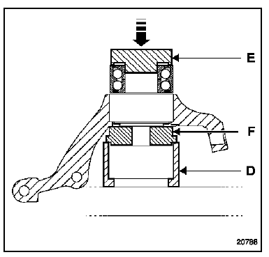 Reposer le roulement dans le porte-fusée à l'aide des outils d, e et f. La cible noire abs orientée côté intérieur du porte-fusée.