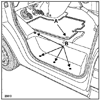 Déclipser le soufflet du levier de frein à main. Dégager le tapis en (1) des garnitures inférieures puis du levier de frein à main.
